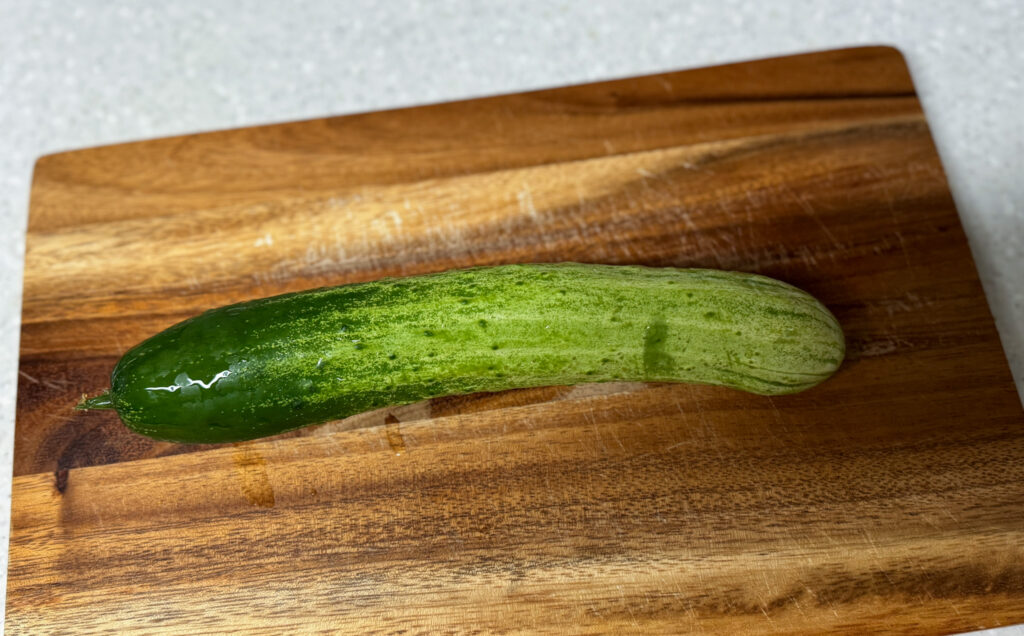 한쪽 면을 다 자른 뒤, 오이를 뒤집어서 같은 방향으로 한 번 더 칼집을 넣어주면