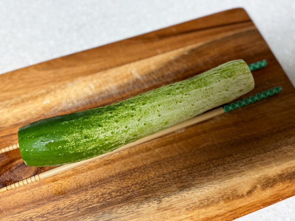 칼집을 예쁘게 내기 위해 오이 양옆에 젓가락을 놓고 사선으로 썰어주세요.
