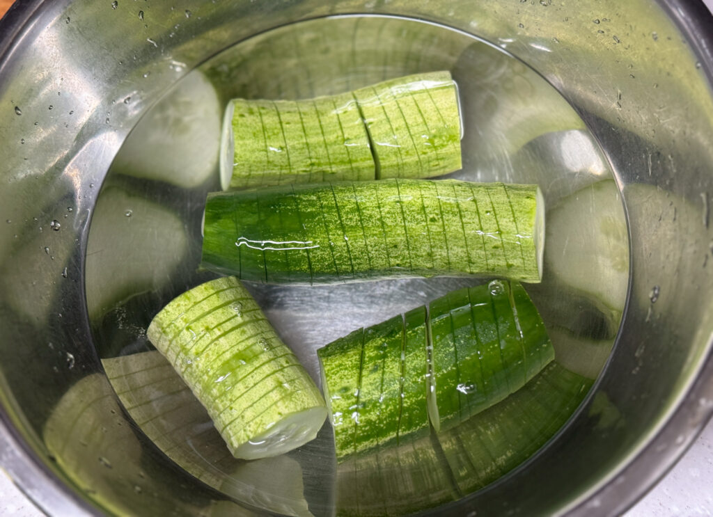 소금물이 잘 섞이면 오이를 넣고 10분간 절여주세요.